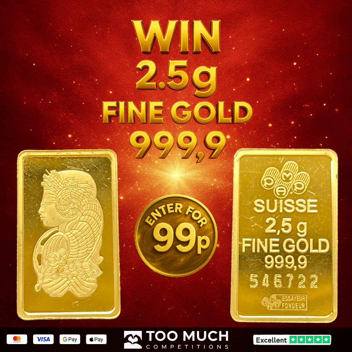 Win 2.5g Fine Gold Bar 999.9/24ct for just 99p! Take the Gold Bar or Cash Alternative £150.