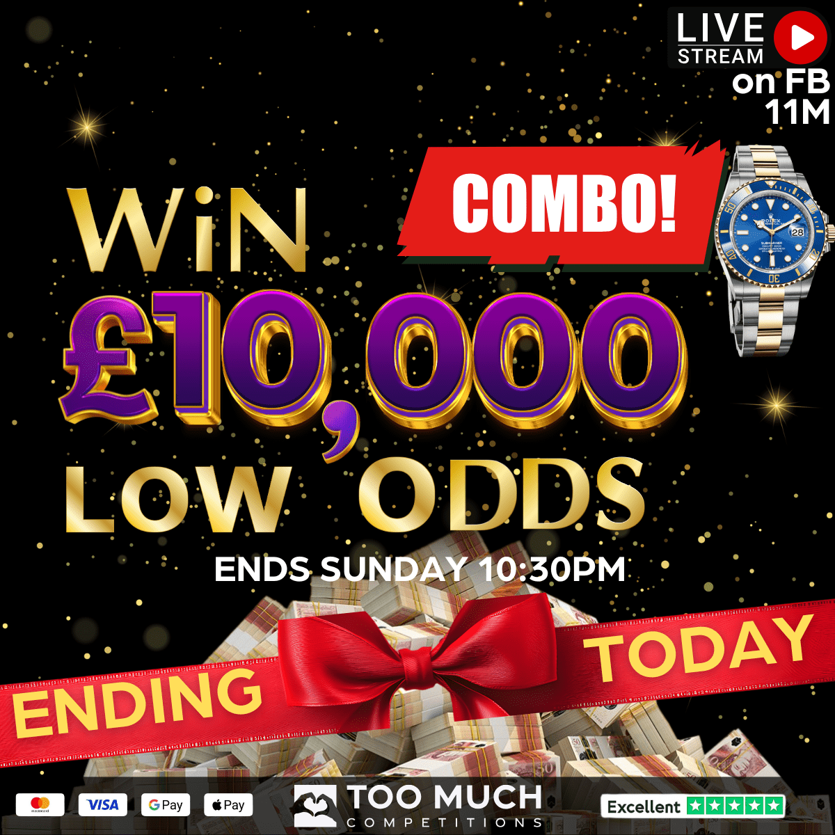 , Get 20 Tickets FREE for the ROLEX SUBMARINER DATE Watch Draw LiveDraw#40 (£13K Cash Alt). MEGA DEAL🔥