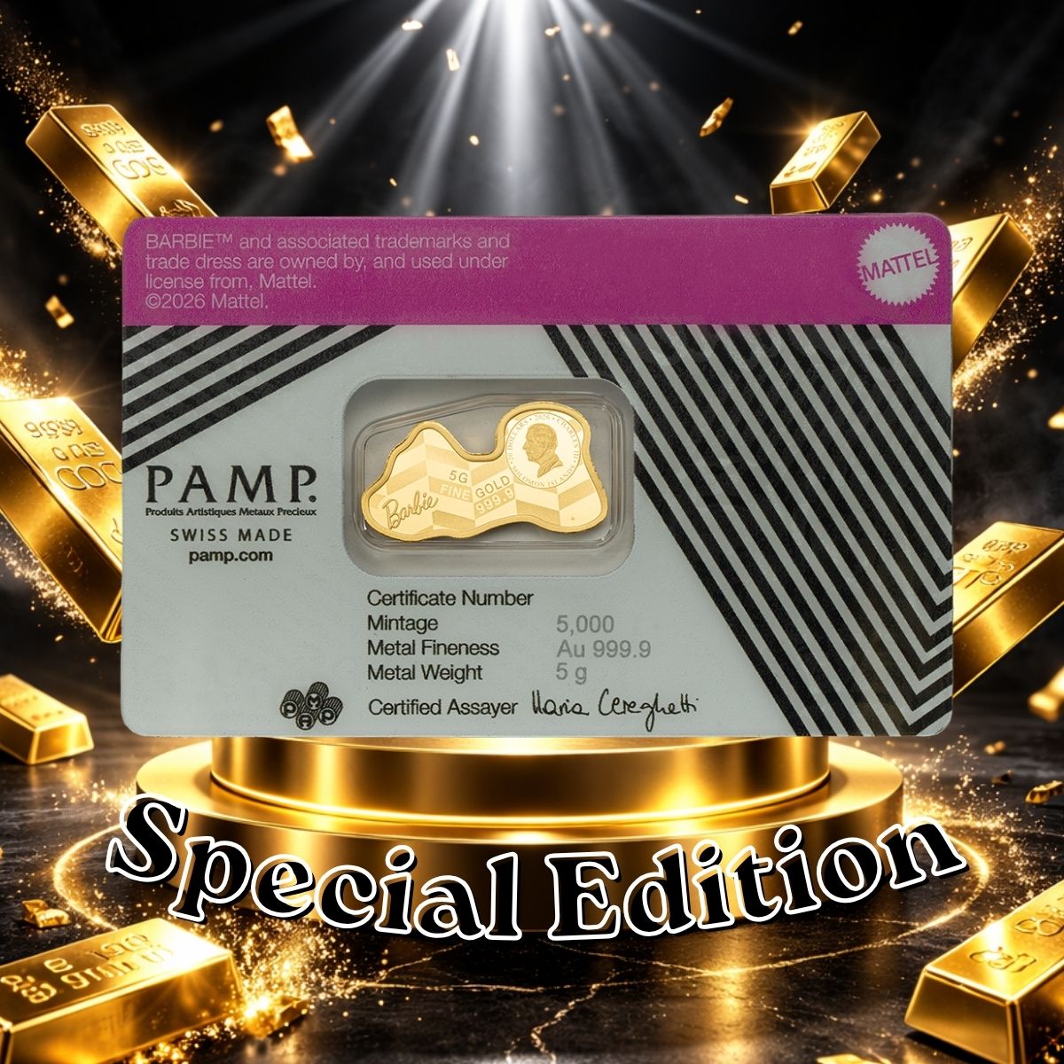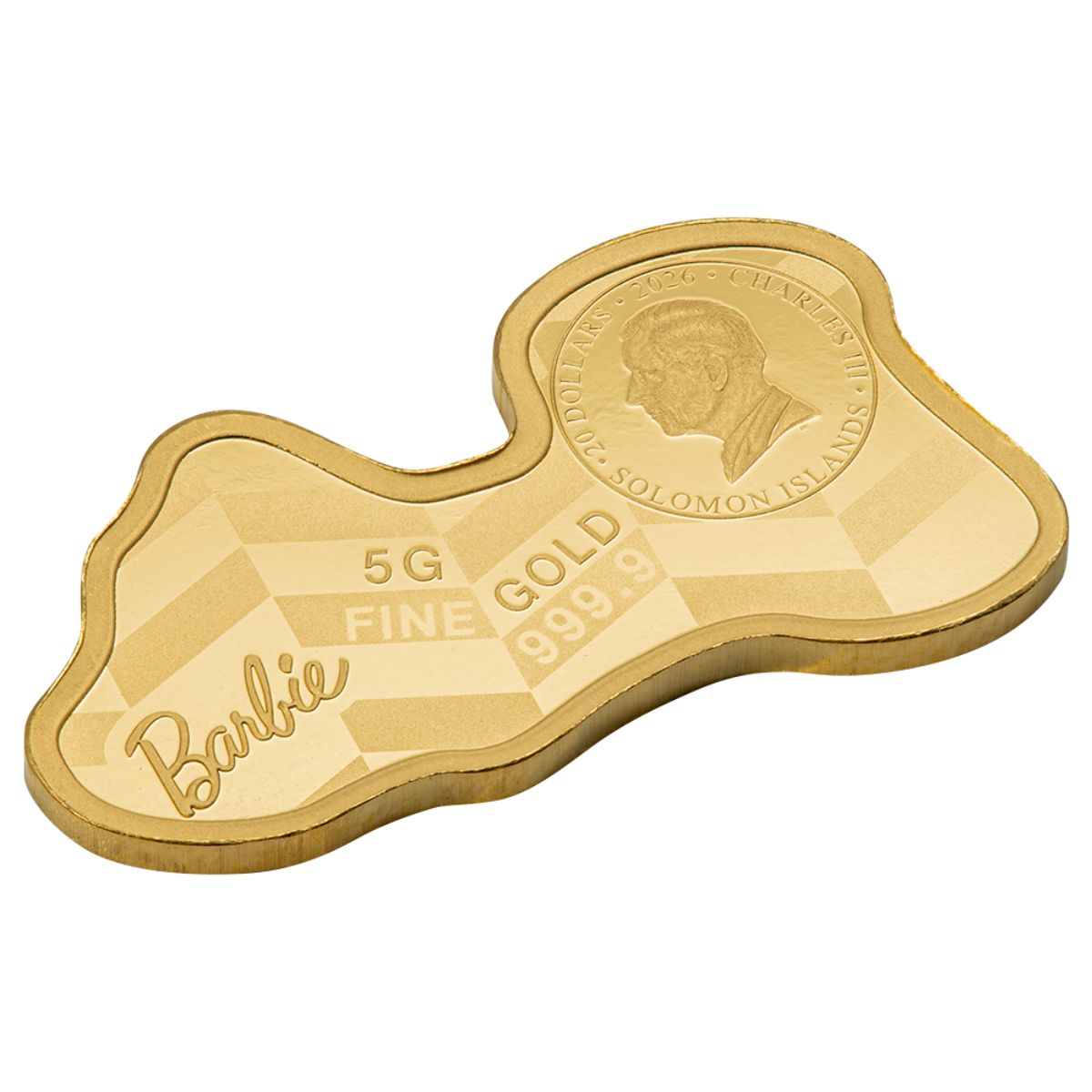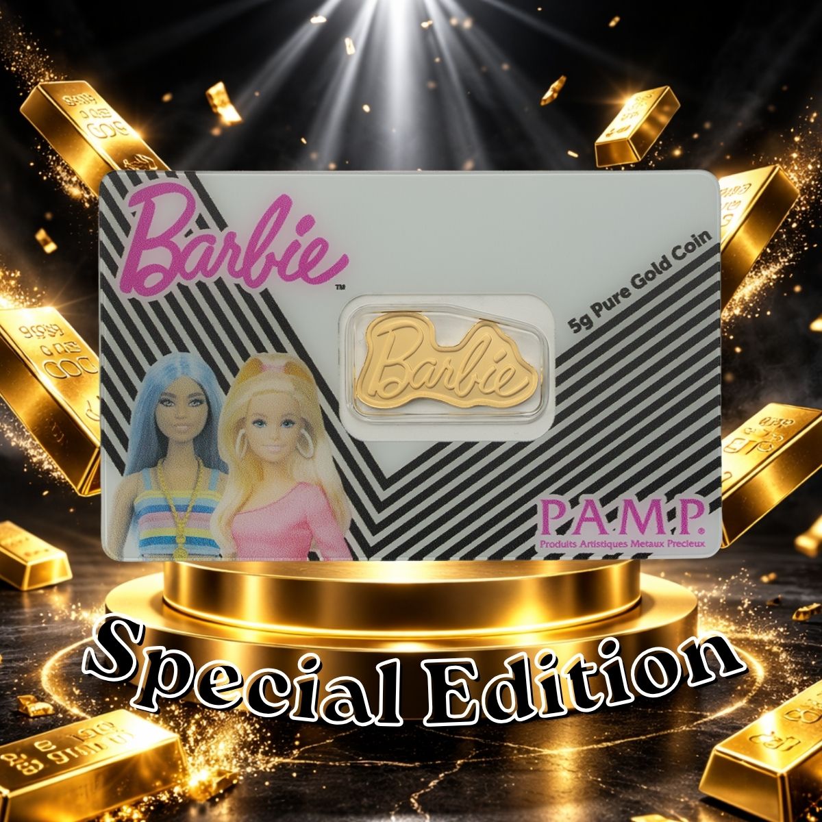 This PAMP Barbie 5g Gold Coin is struck in the shape of the iconic Barbie™ logo, combining fine gold with pop culture appeal. This coin has a limited mintage of 5,000.